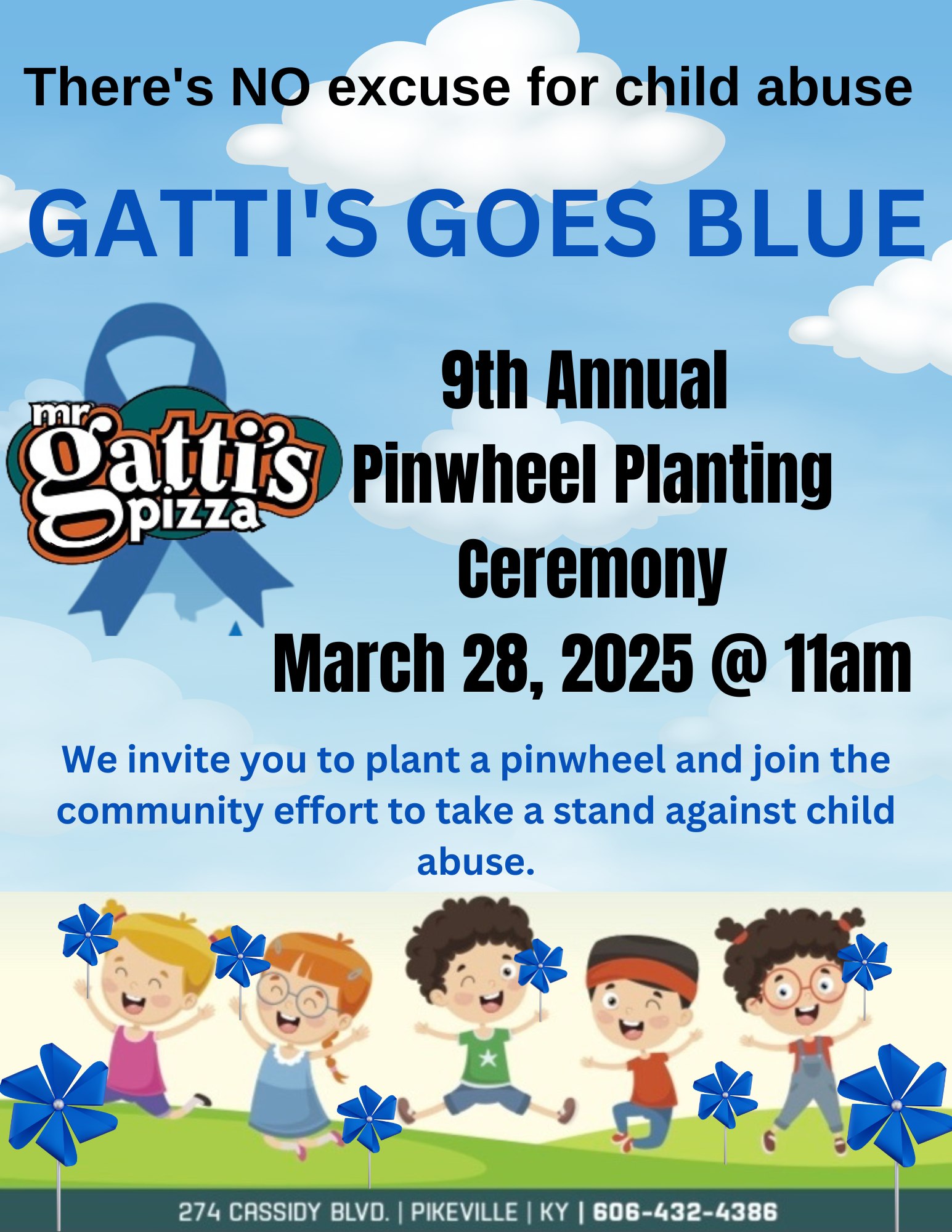 Join us and our friends at Mr. Mr Gatti's Pizza for our annual Pinwheel Planting Ceremony