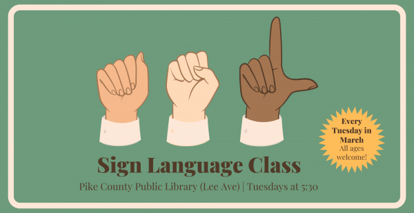 Learn the basics of American Sign Language with this 4-week introductory class! This class meets every Tuesday in March at 5:30 at the Pike County Public Library (Lee Avenue) and is suitable for all ages. No registration required. Please note … Read More