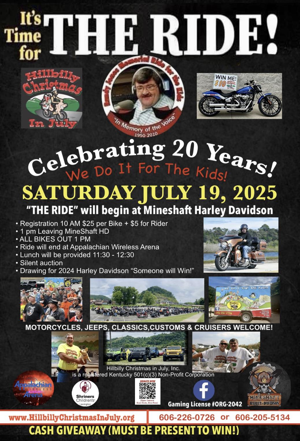 SATURDAY JULY 19, a Milestone Event, for Hillbilly Christmas in July will be Celebrating 20 Years of our "Randy Jones Memorial Ride for The Kids". This year’s event, will leave “MineShaft Harley-Davidson” at 1pm. Registration 11:30 to 12:30 pm. Motorcycles, Jeeps, … Read More