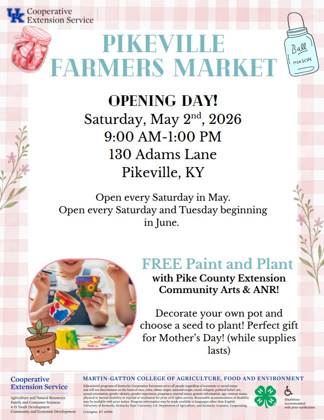 The wait is almost over....The Pikeville Farmer's Market will be opening on Saturday, May 2nd, 2026! Come out and help us kick off the 2026 market season! Shop with a variety of vendors and the Pike County Extension Community Arts … Read More