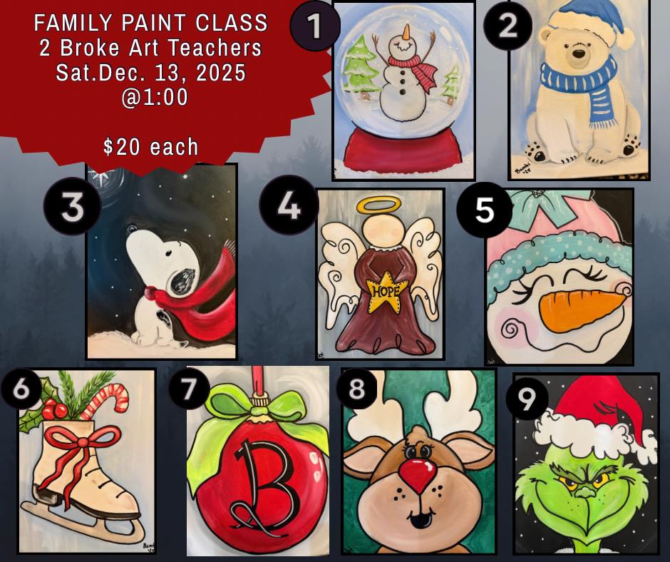 Saturday, December 13, 2025 1:00 PM $20 per painter Pick your favorite painting from the options shown and join us for a fun, family-friendly afternoon of creativity! All supplies included Perfect for kids & adults No experience needed Paint a … Read More