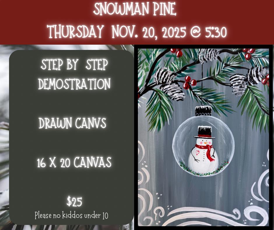 Join us Thursday, November 20th at 5:30 PM for this magical winter painting! We’ll be creating this adorable Snowman Ornament surrounded by snowy pine branches—perfect for your holiday décor! Step-by-step demonstration Pre-drawn 16x20 canvas $25 per painter Please, no kiddos … Read More