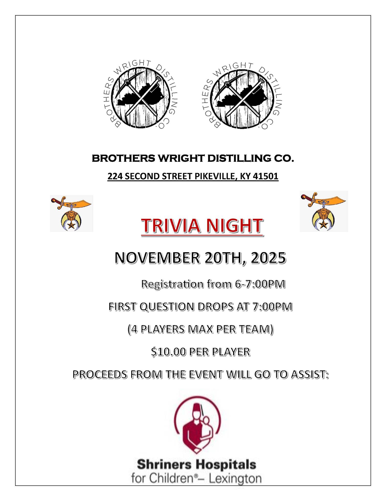 November 20th, 2025, El Hasa Shriners are headed back to Pikeville, KY thanks to Brothers Wright Distilling Co. for another Shriners Children's Lexington Live Trivia!! If you find your schedule free and would like to come out and assist us with this wonderful endeavor while also … Read More