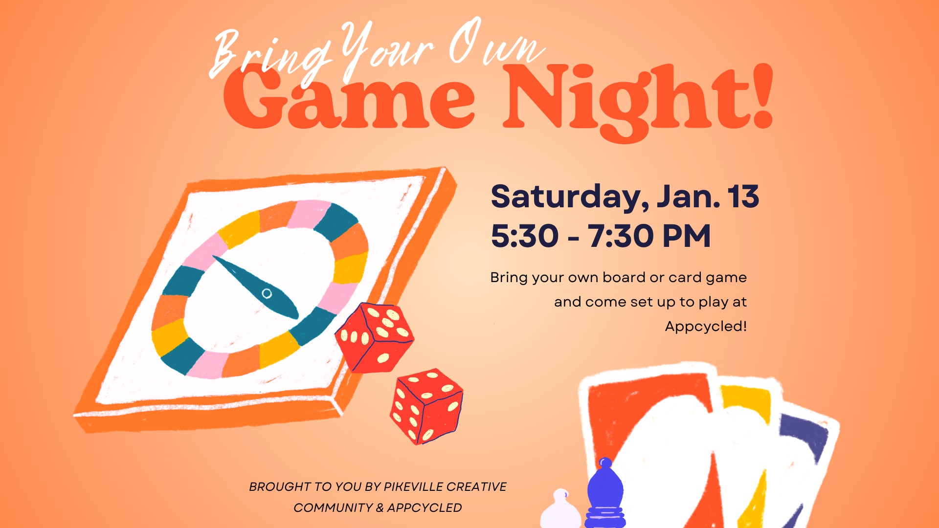 Bring your own board or card games and come set up to play at Appcycled Saturday, January 13th at 5:30. Brought to you by the Pikeville Creative Community and Appcycled |
