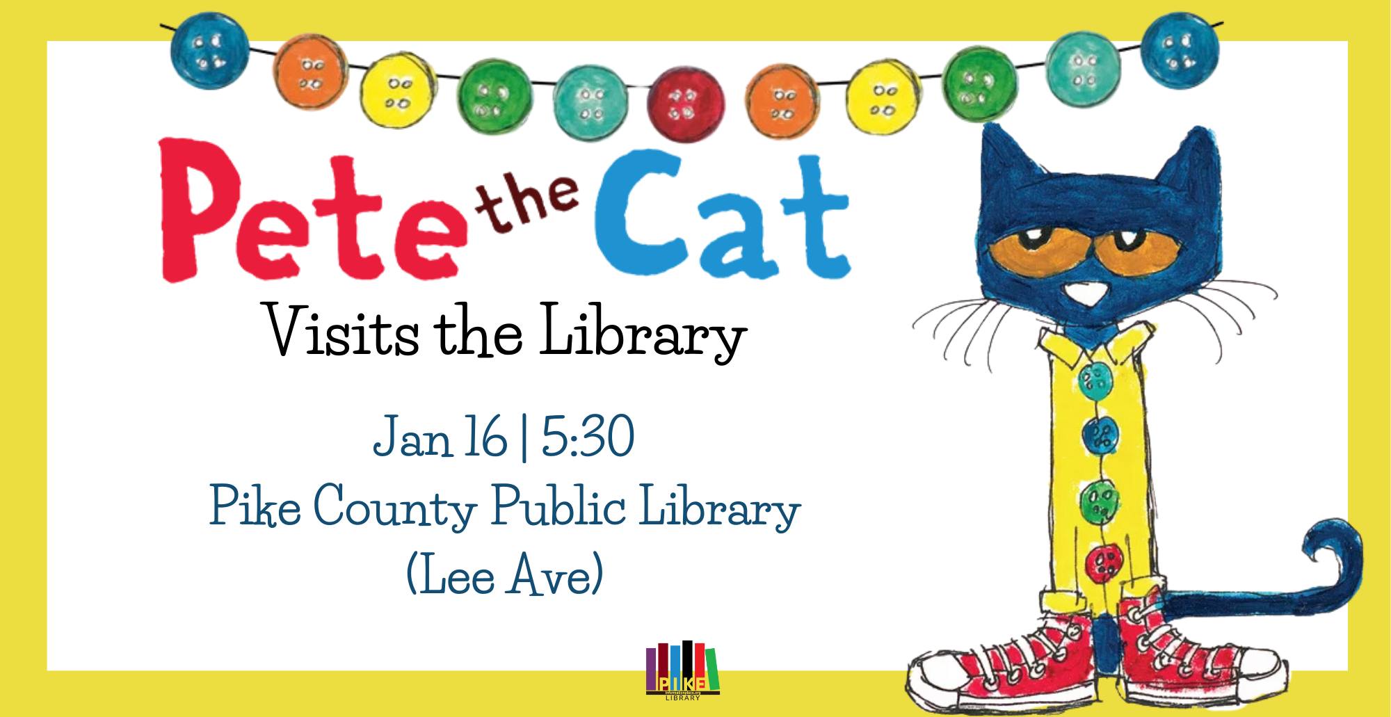 Pete the Cat will visit the Pike County Public Library on January 16th at 5:30 for activities and stories! |