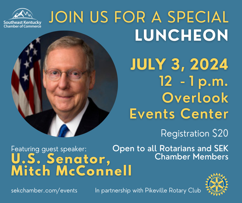 The Southeast Kentucky Chamber and Pikeville Rotary Club are partnering to host a very special luncheon featuring guest speaker, United States Senator, Mitch McConnell!