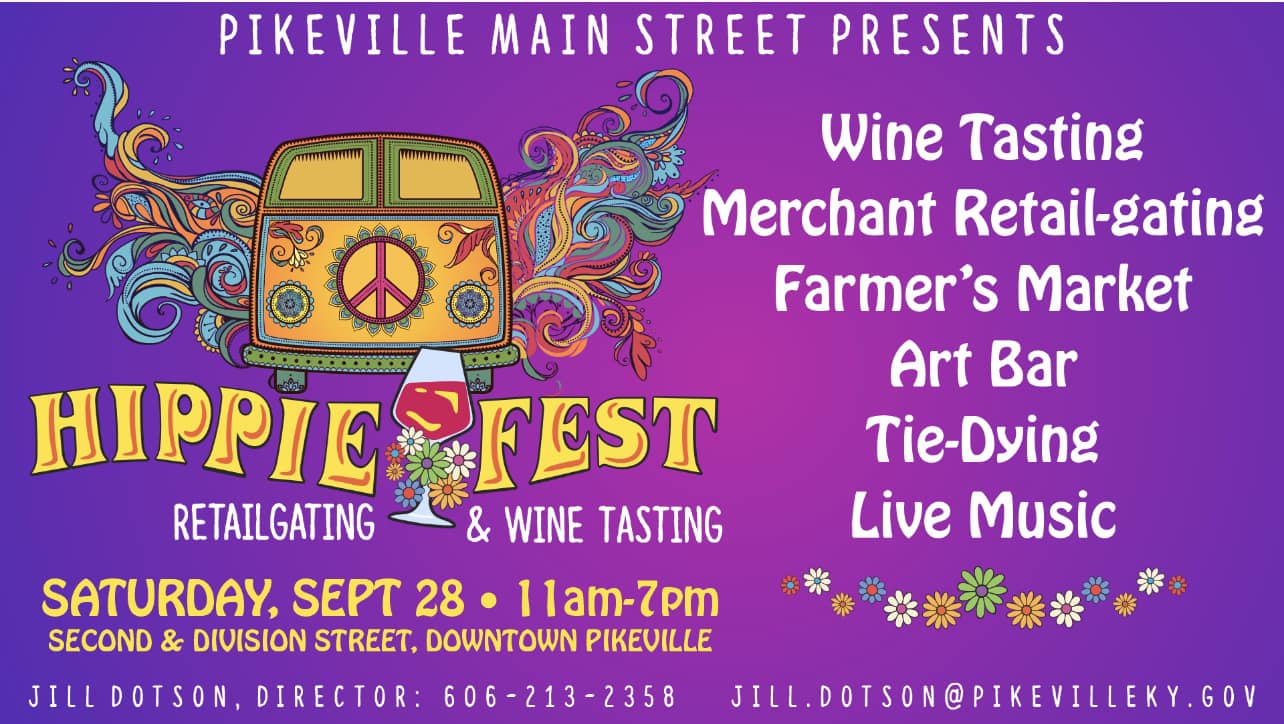 Come join us for a fun-filled day on the streets of Pikeville in your best Hippie gear! Wine tastingMerchant Retail-gatingFarmers Market Art BarTie-DyingLive Music