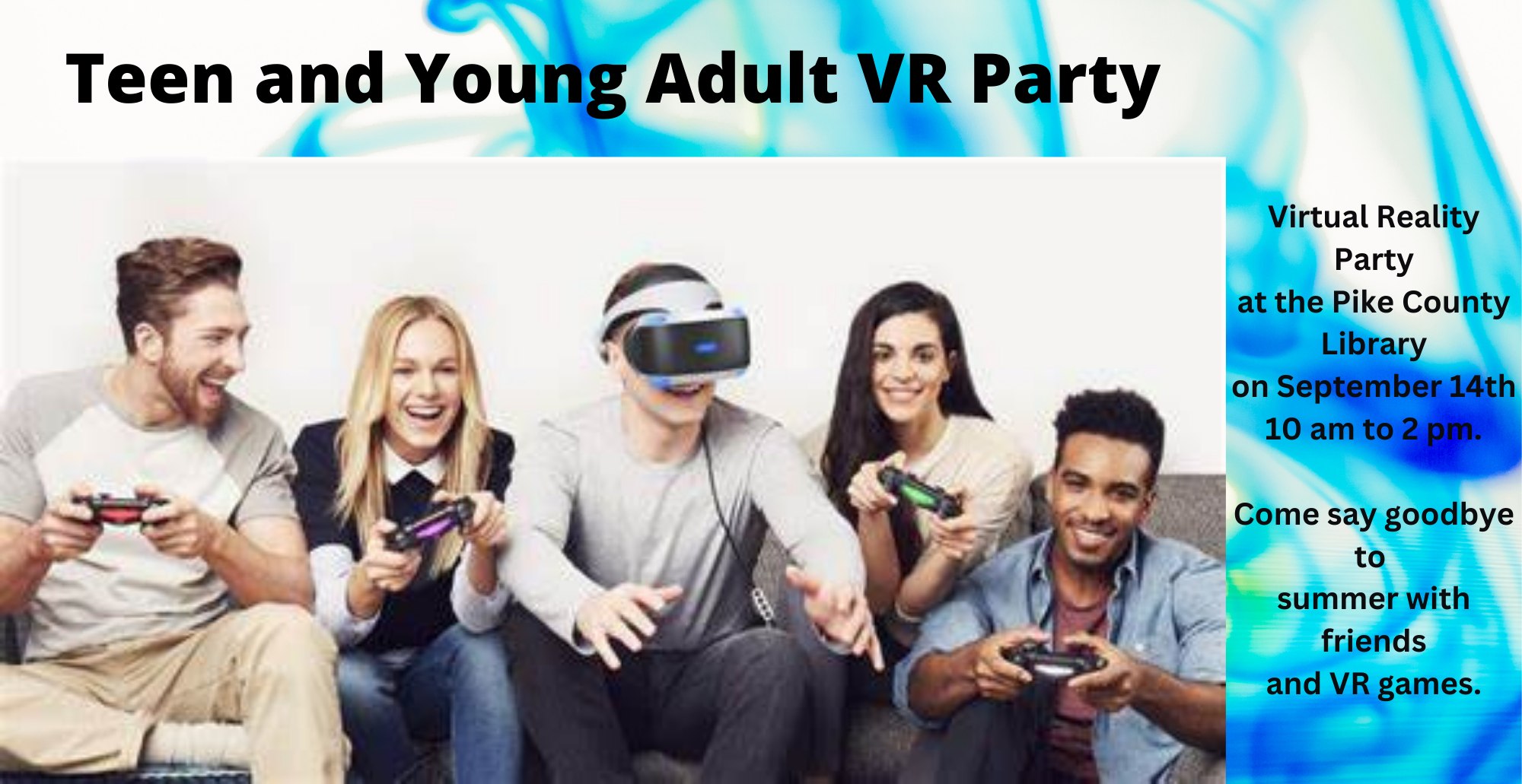 Teens and young adults say goodbye to summer with friends and VR games. No registration required. This program will be held on Saturday, September 14 from 10:00-2:00 at the Pike County Public Library (Lee Avenue) in the Teen Room.