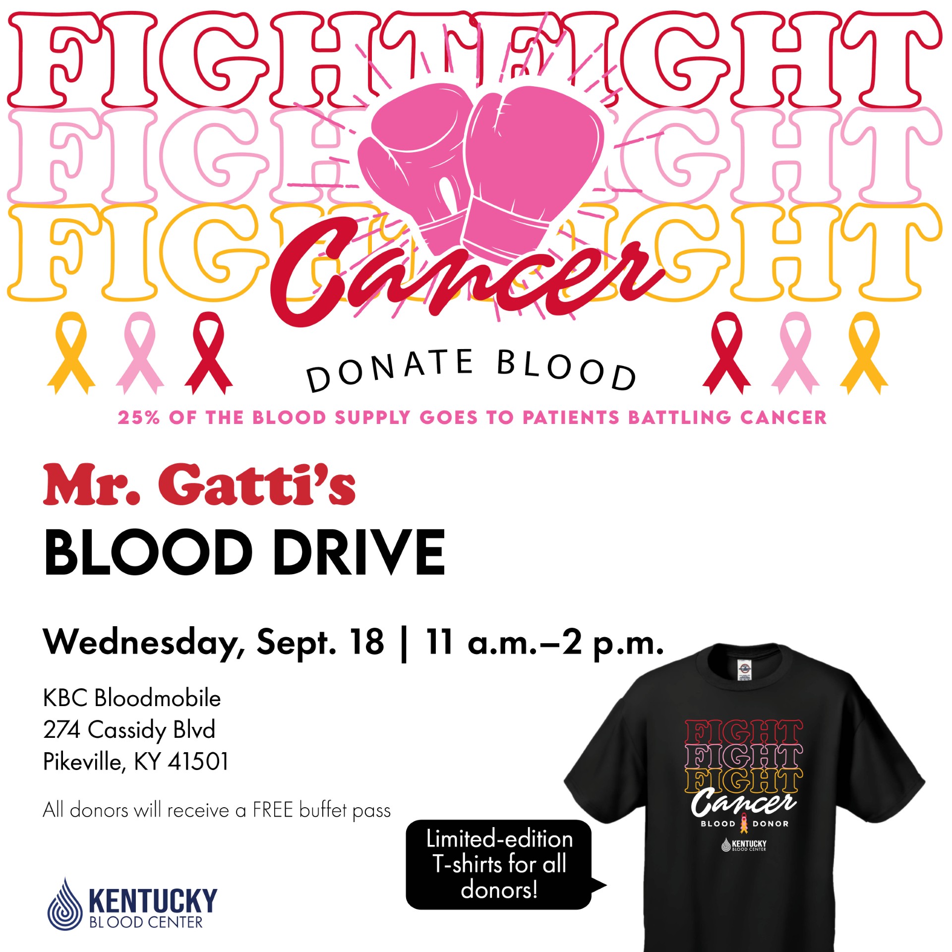 Mr Gatti's Pizza is holding a blood drive on September 18th!!Come out to support this great cause! Free buffet pass and limited-edition T-shirts for all who donate!!