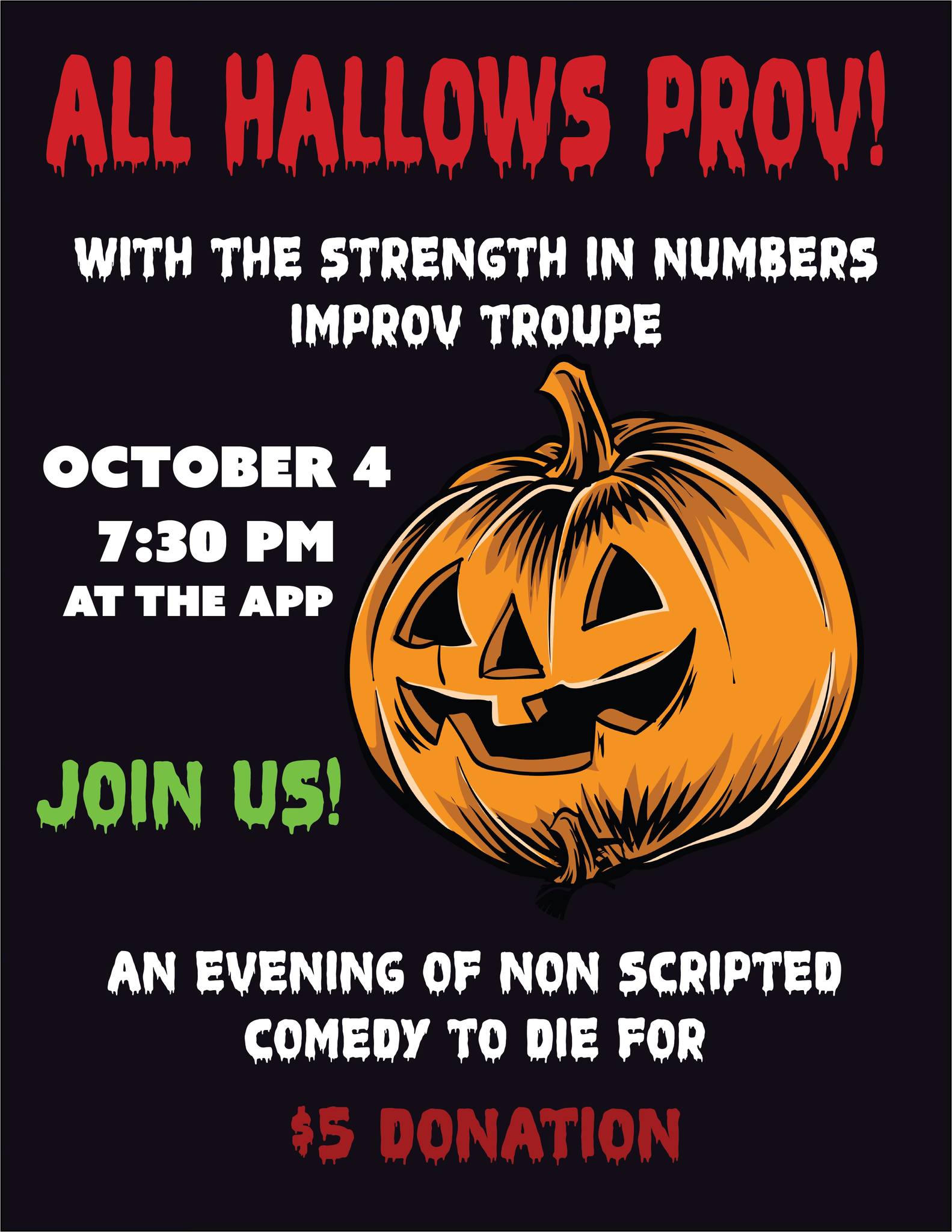 Are you looking for a fun evening to kick off spooky season? Join us Friday October 4th at 7:30 PM for All Hallows Prov! Free fun with a suggested $5 donation |